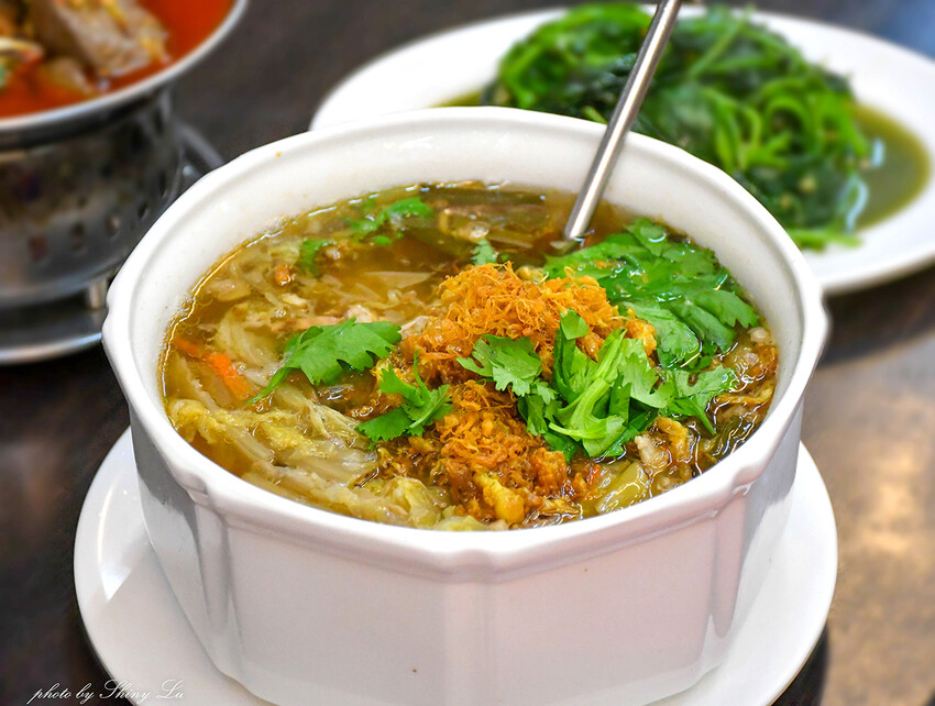 但店家的清燉西魯肉,料超多!用湯匙隨便一撈,都可以看到滿滿的配料,上面灑滿蛋酥,湯頭有著濃濃古早味,讓人一試成主顧