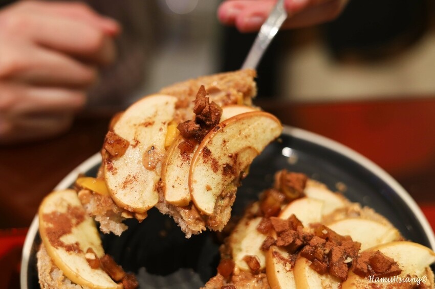 一咬下去肉桂味馬上出來,這種香料為整體口感帶來了溫暖的辛香,與蘋果的甜味非常搭