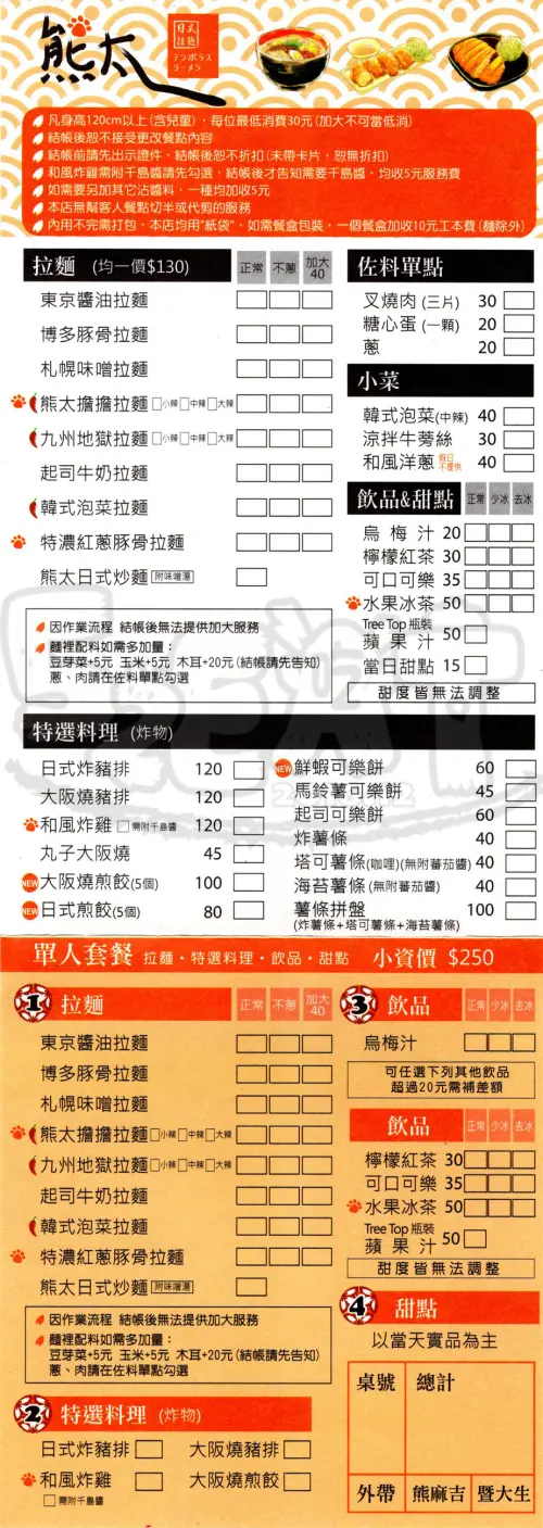 - 身高$120公分以上,每位基本低消$140元。不得用拉麵金額累加。
