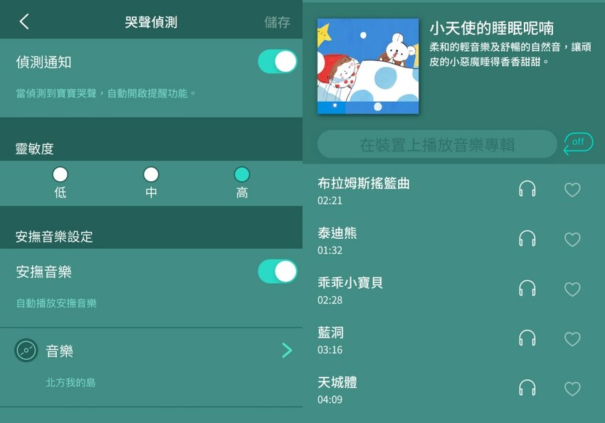 - 內建安撫音樂,寶寶哭泣時可以即時啟動。