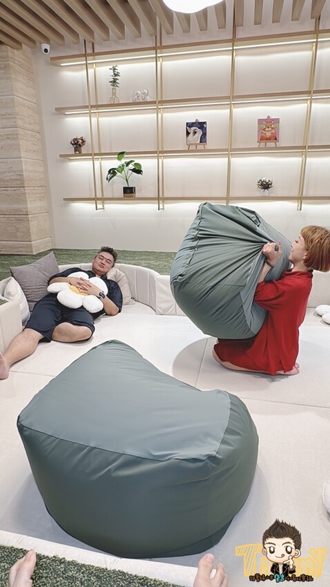 近期改裝後,新增了下沉式樂聚空間,搭配大地色系地毯、可愛花朵抱枕及懶骨頭,讓大家可以盡情耍廢
