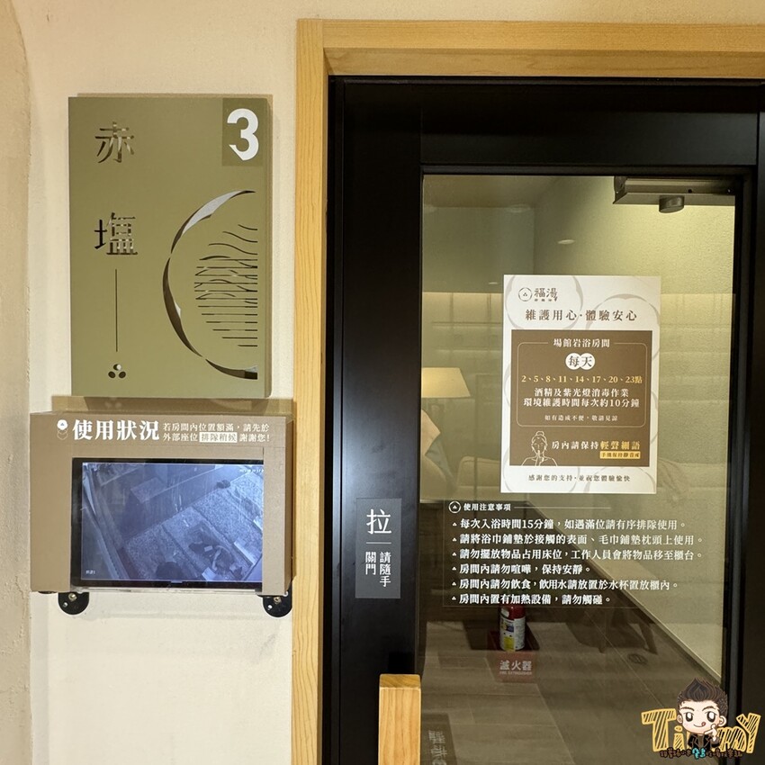 每一間岩盤浴門口有溫度顯示,大家可以從最低溫的開始囉。