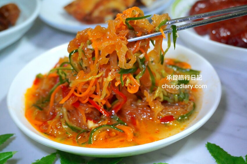 宴客冷盤小菜的當中,經典常見的涼拌海蜇皮,吃起來是Q彈爽脆的口感!每一口都是來自大海的氣息,還能吃到小黃瓜絲與紅蘿蔔絲,味道帶點微辣,也更顯清爽開胃。