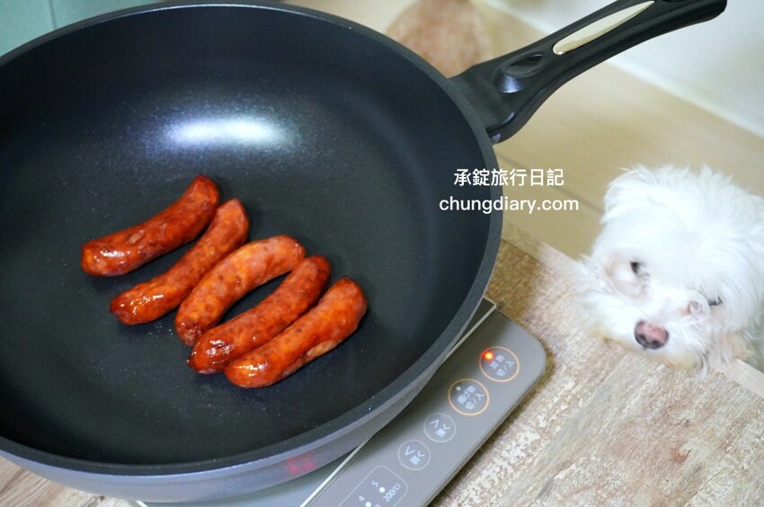 在煎香腸的過程當中,整個室內都充滿著誘人的豬肉甜香,可是讓我家小鳳梨🐶,一直站在桌邊前,眼神緊盯著鍋子裡的香腸。