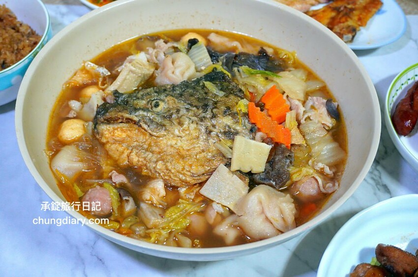 大家一起圍繞在桌前,品嚐【福樓冷凍調理包】的好滋味!分別有:古早味米糕、手工自製香腸、烤魚下巴、三杯雞腿肉、涼拌海蜇皮、與砂鍋魚頭火鍋,五菜一湯實在是太豐盛了啊!