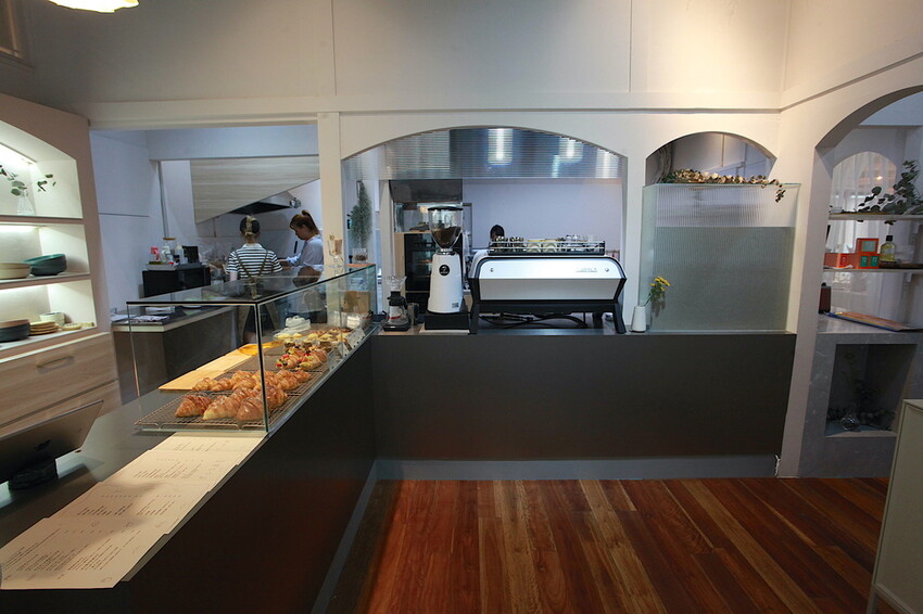 櫃檯上玻璃櫃裡有放置麵包和甜點供挑選。