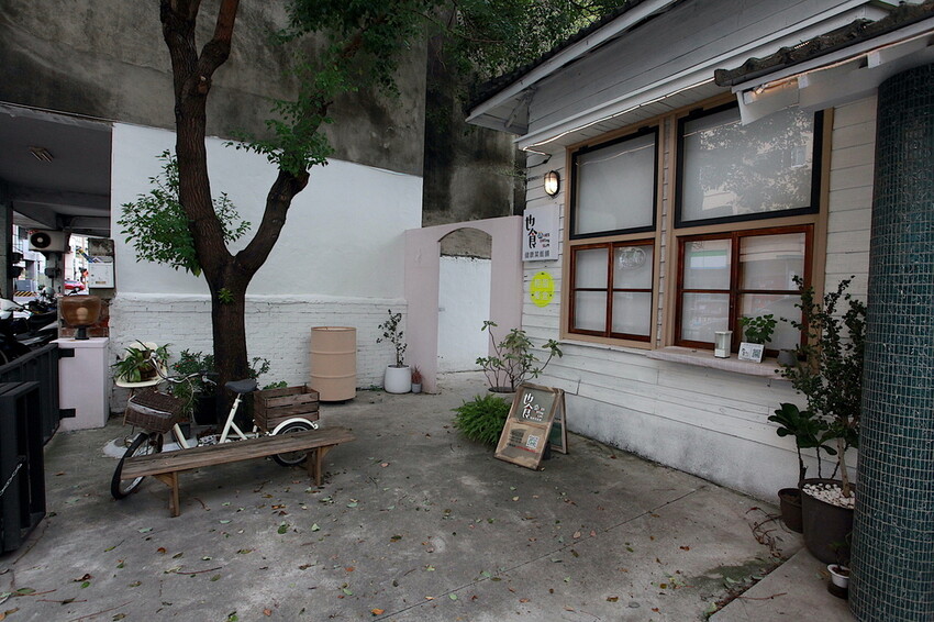 大樹底下擺放休閒自行車倍感親切,有點不懂?外頭會有「也食健康飯鋪」的招牌