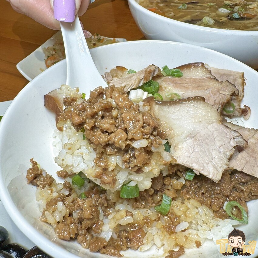 招牌肉燥佐現片豬肘拌飯(215元),除了招牌肉燥以外,還有半肥瘦蹄膀