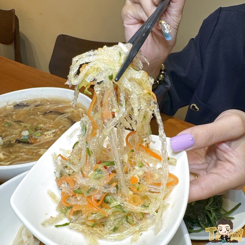 寒天三絲(45元)有寒天絲、小黃瓜、紅蘿蔔絲,寒天絲類似海蜇皮脆脆的口感,不僅熱量很低,還有豐富膳食纖維~
