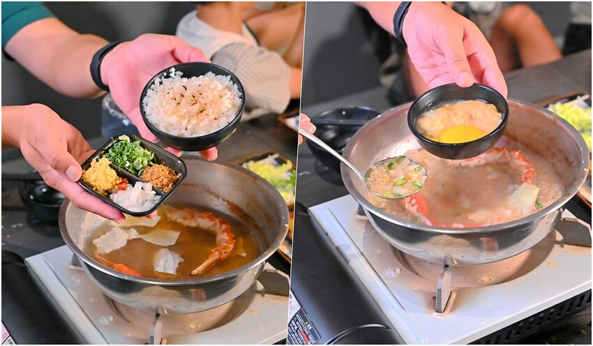 前面有沒吃完的食材也可以加進去,煮到整個湯頭稍微收乾微稠就可以吃了。在原本就已經有蟹香鮮味的湯頭裡又加進了蟹黃的濃郁鮮味,還有蔥花、蒜酥等等點綴,就算已經吃飽了這雜炊的鮮美滋味還是非常棒,讓人忍不住又吃了兩碗。