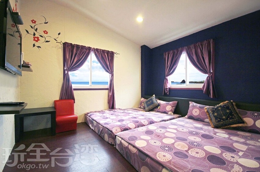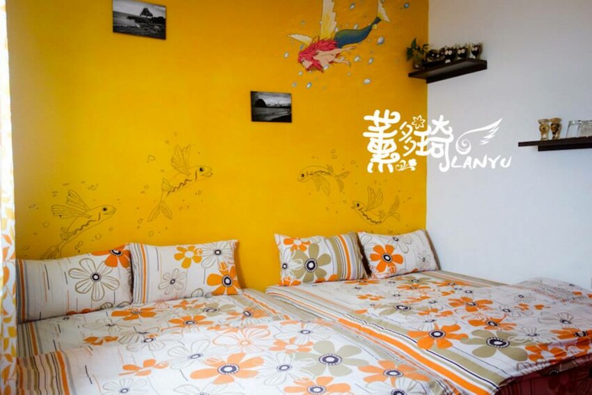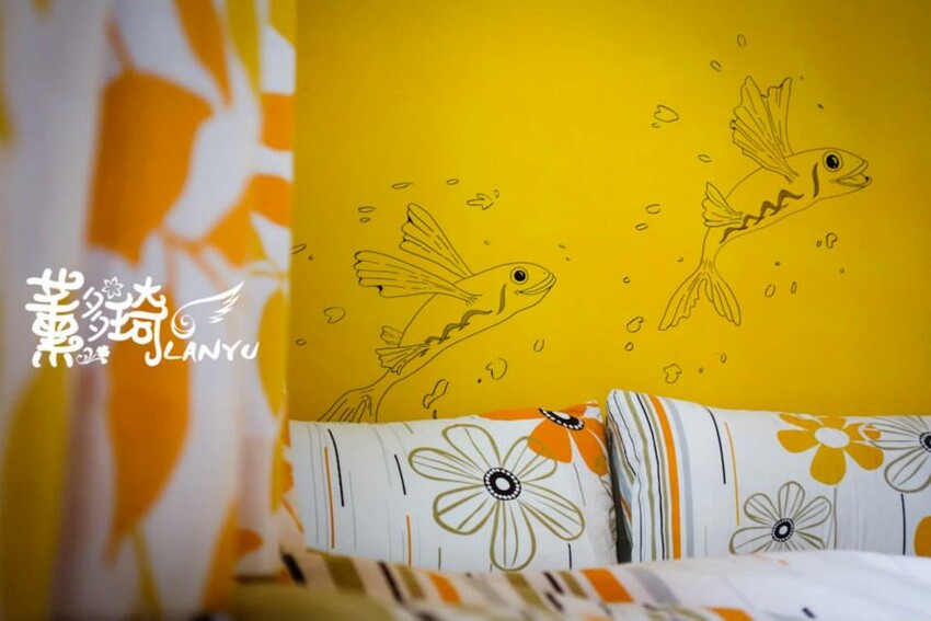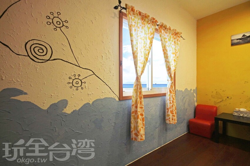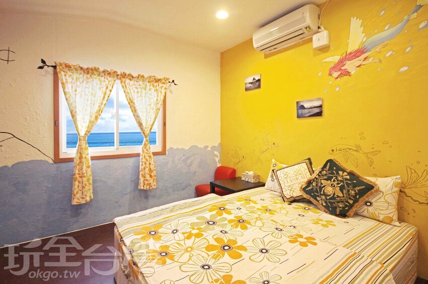 是可以遙望窗外的海景的客房 ,牆壁以鵝黃色為主要色調,以飛魚為主要圖案。