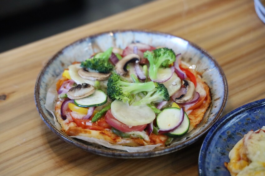 烤好的披薩再用釉藥堂創作的盤子盛裝,繽紛的色彩是不令人食慾大開!