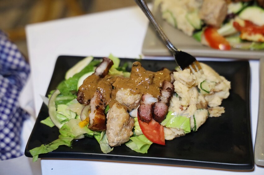 這天現烤的鹹豬肉、雞肉丸、生菜沙拉及特調醬汁,搭配鶯歌的晚風涼夜,特別地愜意!