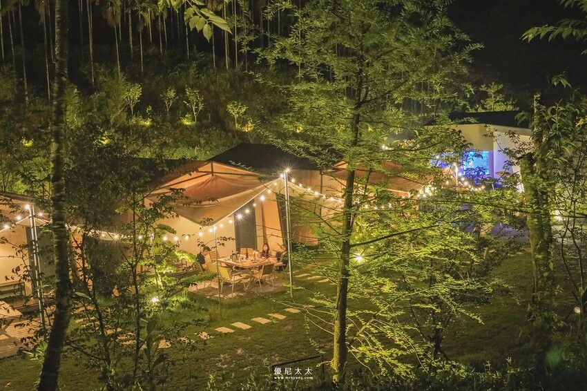 其實很多旅人都是為了這個夜景來到葉子秘境,當黑夜降臨,園區的燈飾亮起,群林環繞下還聽得到蟲鳴,這一帳帳小帳篷在星空及燈光點綴下,彷彿來到森林中的童話小屋,光是在園區散步就夢幻。而每一帳前都有座椅區,大家舉杯暢談,這個環境實在美的不像話