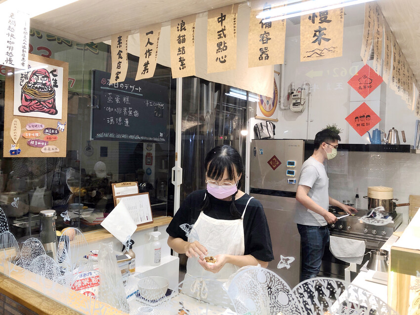 基隆仁愛市場美食的聚集地,從鹹食到甜食、主餐到咖啡點心應有盡有,是旅客來基隆尋美味的必訪之地。搭乘仁四路入口的電扶梯至仁愛市場二樓右轉往 D34 攤前進。小恭喜珈琲網路評價 4.8 ,風評不錯的基隆素食咖啡廳就隱藏在仁愛市場的角落裡。