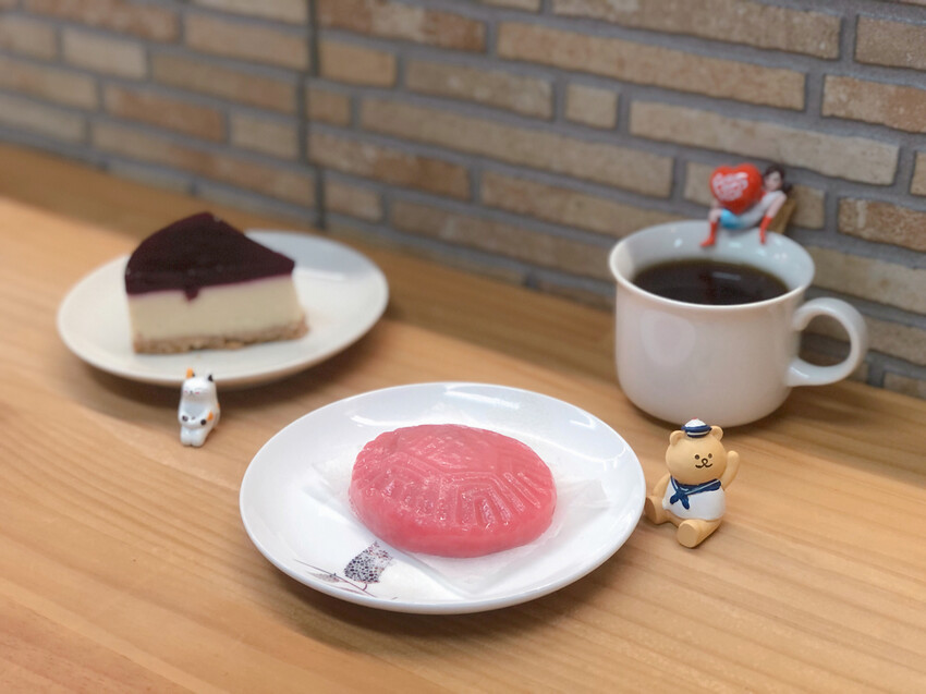 不添加蛋奶成分以豆漿為優格食材和味噌原料製作的藍莓乳酪蛋糕。這道自製的甜點質地相當細緻口感輕盈毫無甜膩感,果凍般的藍莓、綿密的乳酪,甜度適中,搭配中淺焙微酸的谷極科夏咖啡,真是完美組合。