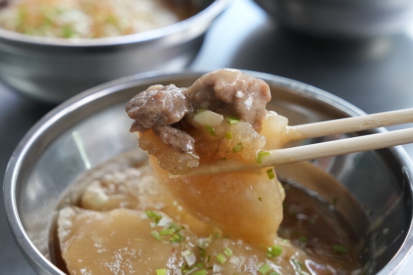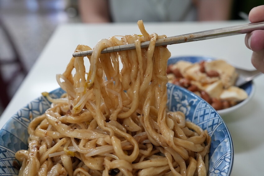 「老士官擀麵」的麵條是店家每天手工現擀出來的,吃起來非常Q又帶點嚼勁,淋上油蔥酥醬和麻醬後香氣十足,一不小心就嗑完整碗!