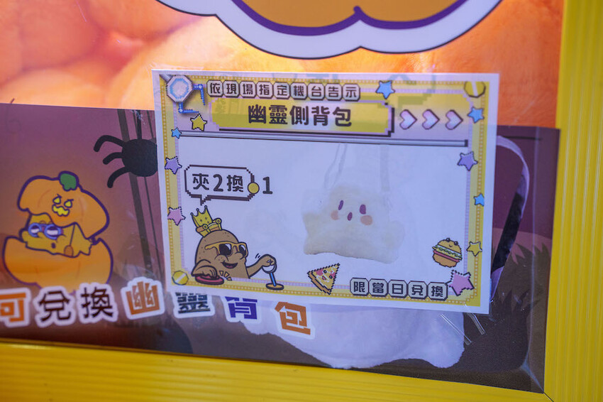 因應萬聖節,沙發馬鈴薯樂園還推出了兩個限定活動,活動一是夾萬聖節指定機台可以兌換幽靈側背包~活動二是只要穿著或配戴南瓜相關飾品並拿打卡板拍照,上傳貼文就可以得到一張三次卡,萬聖節一定要約朋友來報到呀!