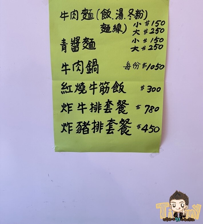 牛肉麵小碗150元有4塊肉、大碗250元有8塊肉,另有炸牛排和炸豬排套餐。