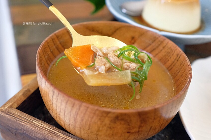 附上的湯品是味噌湯,真的好像我在日本喝到的味道,現在天氣慢慢進入秋序,大家應該也有感覺到涼意,在這種天氣來一碗熱騰騰的湯品喝,真的讓人感覺很幸福。