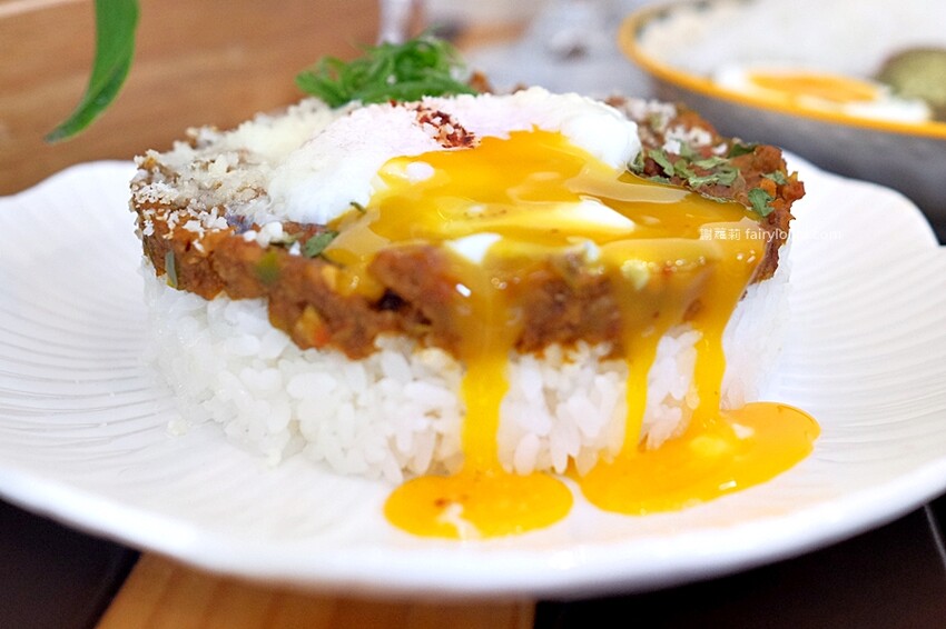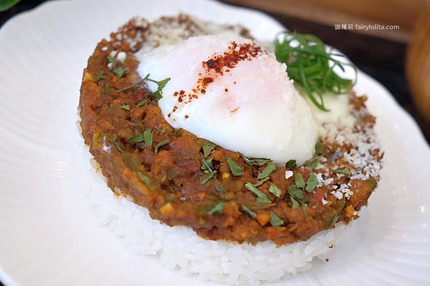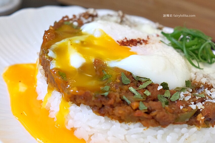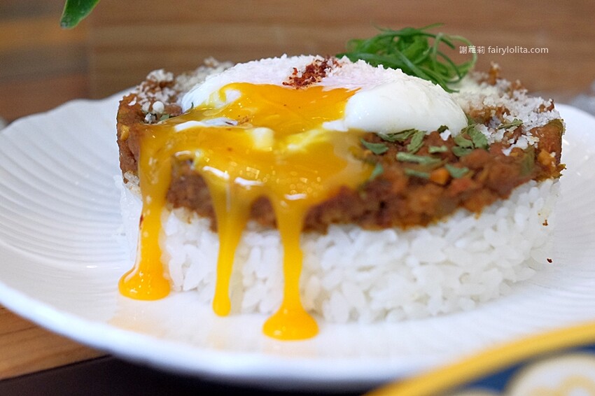 黃橙橙的蛋液就像噴泉一樣,不斷地流了出來,只能說這個乾咖哩真是太邪惡啦!