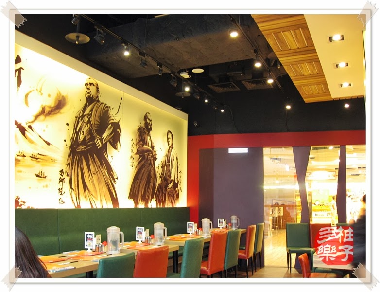 以日本拉麵店來說,這家裝潢的辨識度超高,除了入口處大大的《三士》標誌外,就屬請插畫大師茂本秀吉(Hidekichi Shigemoto)以寫意水墨描繪坂本龍馬、維新三士及鹿兒島景緻的牆面,真是豪氣萬千!