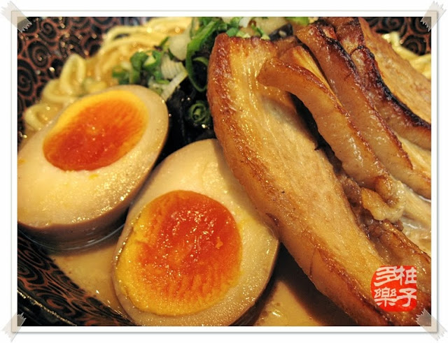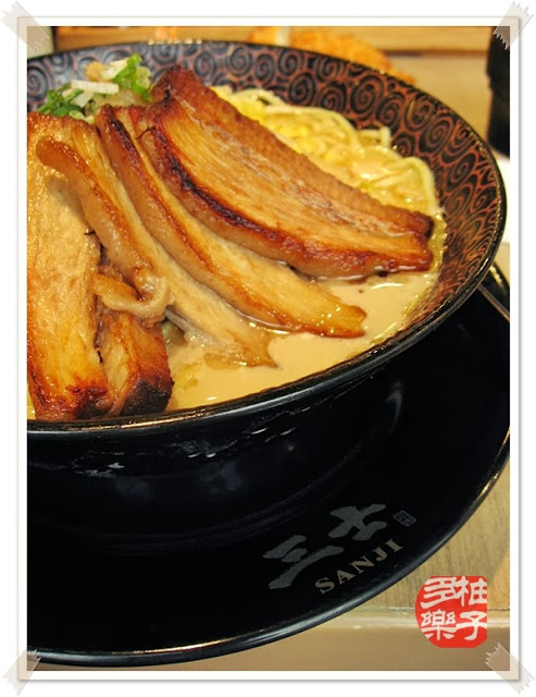 主餐華麗三士拉麵上場,排場夠力:四大片厚切叉燒肉、整顆的塘心蛋、筍乾、蔥花、豆芽菜、木耳絲與玉米粒,配上濃郁的高湯與大份量拉麵,灑上蒜酥,美味しいです!