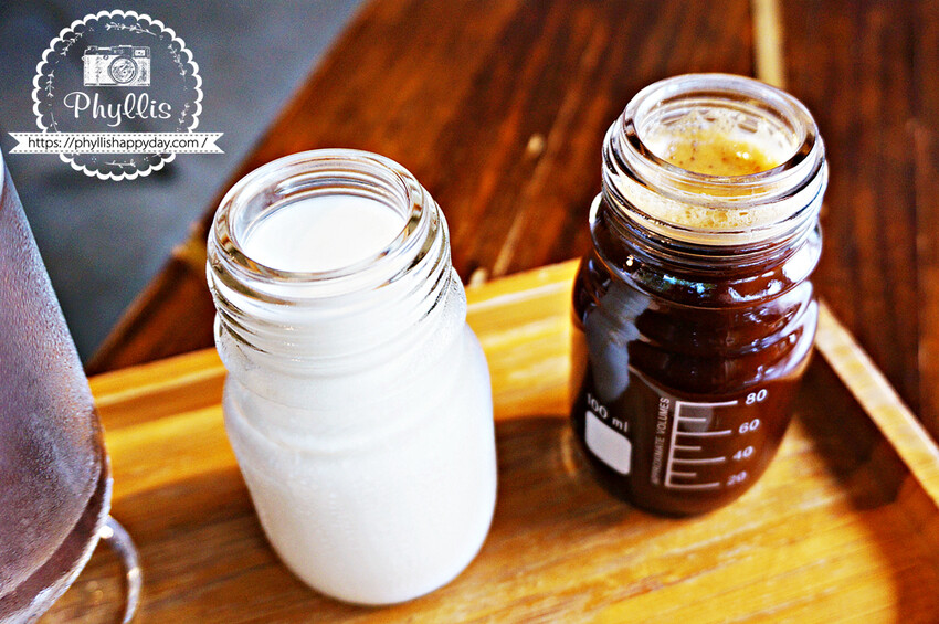店員推薦的喝法是把濃縮咖啡及牛奶加進來