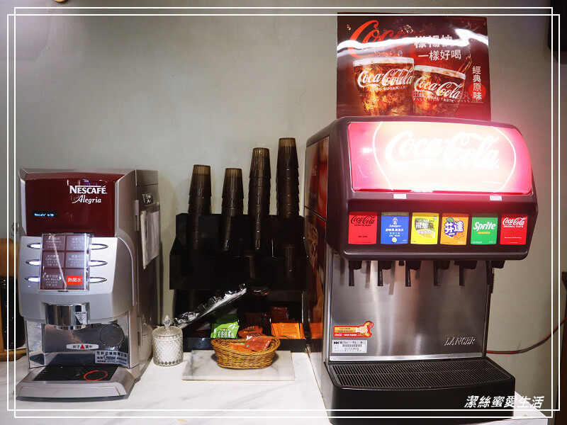 飲料有基本款汽水機及咖啡機,中間有茶包自己來。