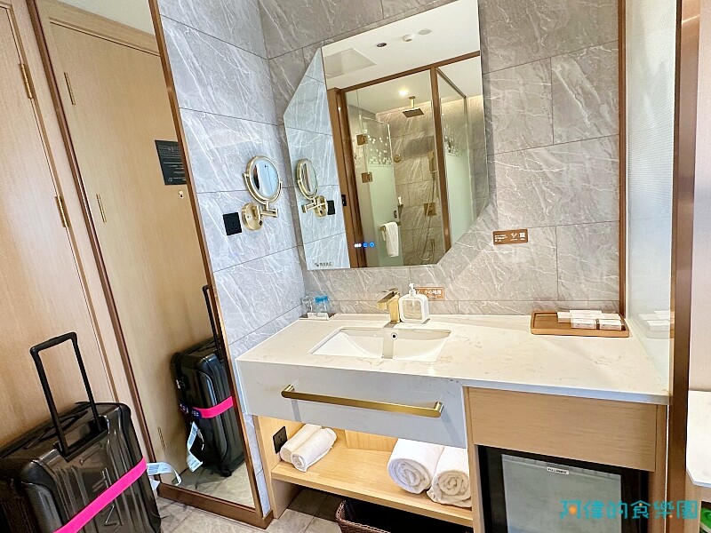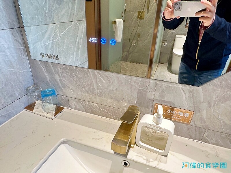 鏡上有溫度顯示,也有除霧按鍵。水龍頭旁有洗手液,比一般酒店用那種一泡水就爛爛的小肥皂好得多。