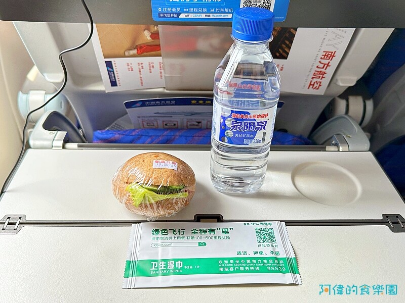 由於整個航程約1.5小時而已,所以僅供簡單的點心,有雞肉漢堡/三明治可選,我選雞肉漢堡,冰涼涼的。另外附一瓶礦泉水。