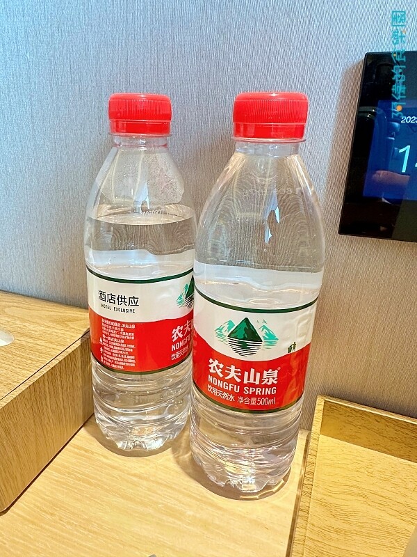 兩瓶礦泉水有一瓶被喝了,竟然沒收走,還好我發現,沒有立刻打開喝,太噁了!