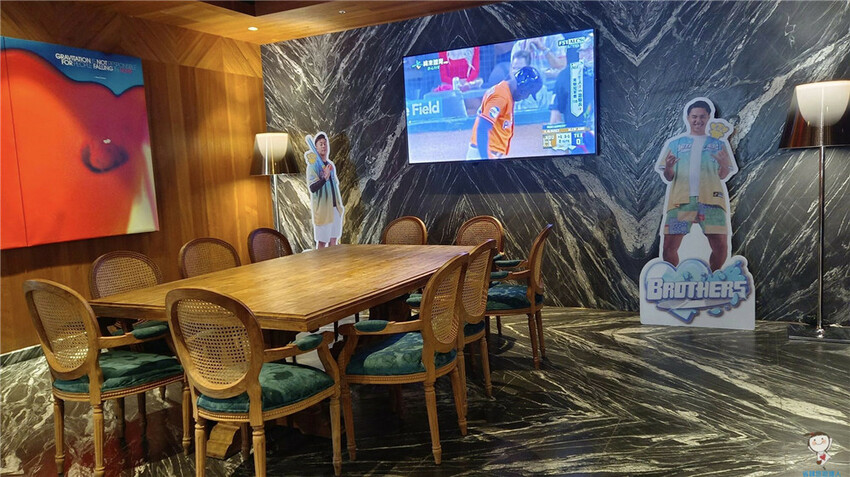 繼續往裡走,牆上掛著大螢幕電視牆,前面的10人座位可以讓人坐在此看運動賽事