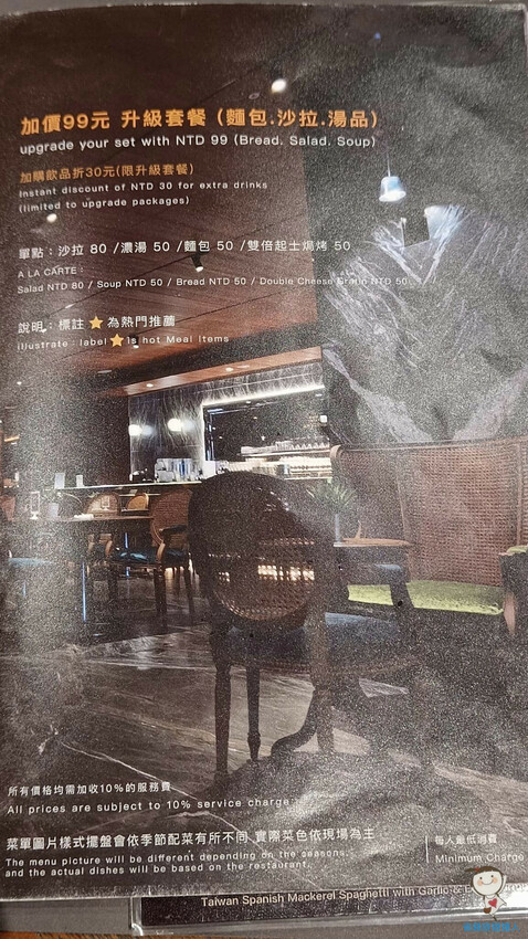 所有餐點只要加$99就能升級成附麵包,沙拉和湯品的套餐,加購飲品還能折抵$30