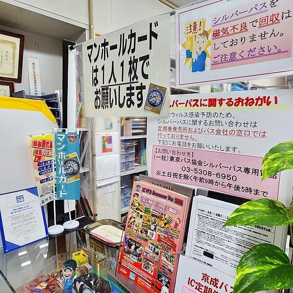 這次主要目的的下水道卡,就貼在櫃檯,簡單的不好意思或午安日文,再指個圖片,工作人員就會了解意思。櫃台的玻璃櫥窗,也有賣烏龍派出所的商品,別的地方買不到喔! 喜歡直接買起來啊!!