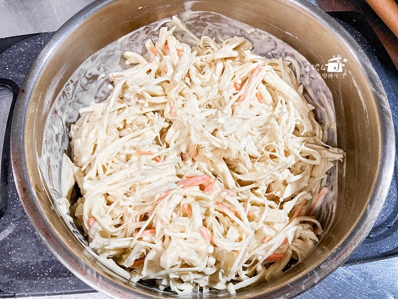 麵衣調勻後放入全部材料拌勻後靜置10分鐘,確保所有材料都沾裹上天婦羅的麵衣