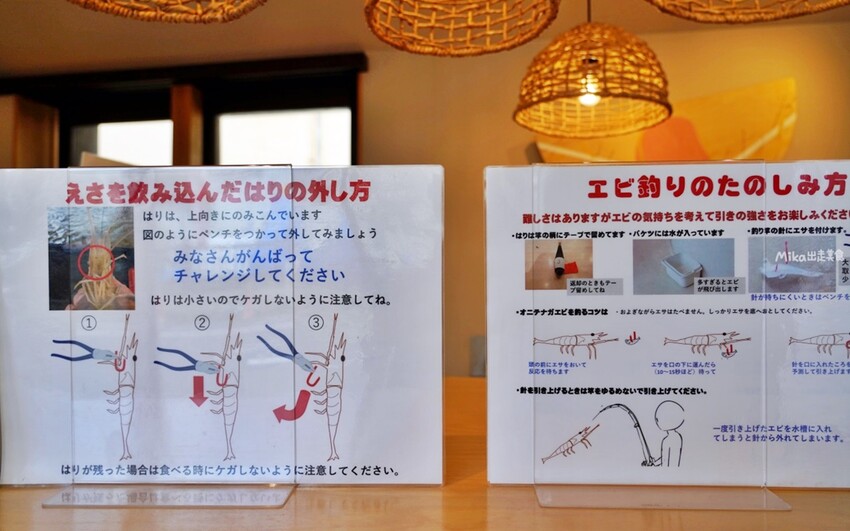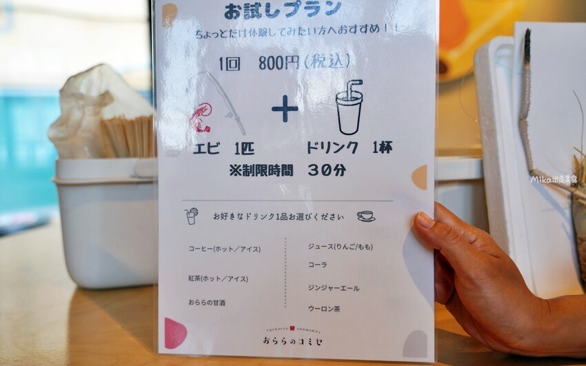 釣蝦體驗約30分鐘,一人一次一隻蝦+任選一杯飲料共800日圓。