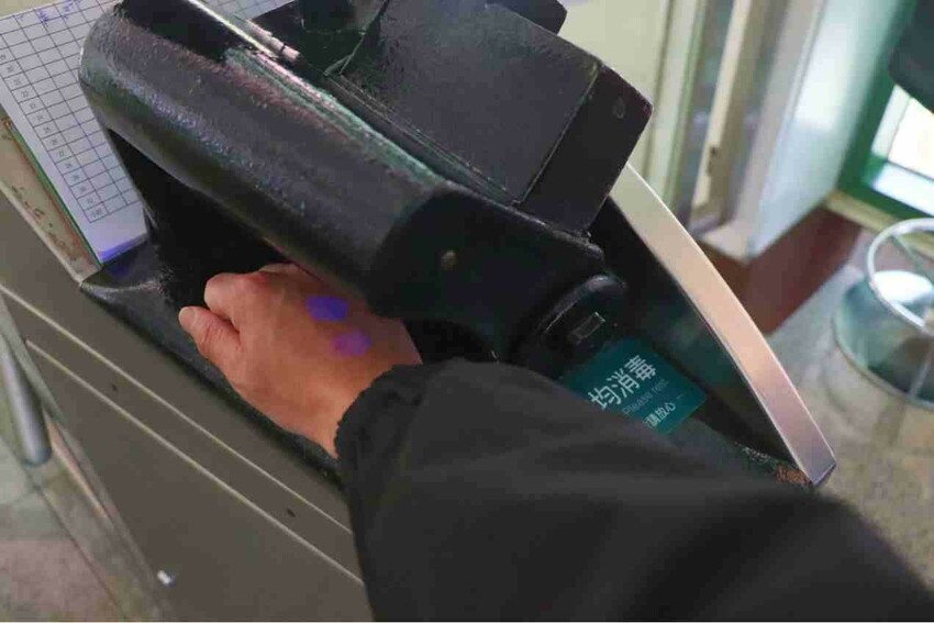 抵達九族文化村門口,這時不用再出示條碼了,只要給機器照一下剛剛的手章就可以輕鬆入園。(記得洗手的話不要太用力搓唷~)