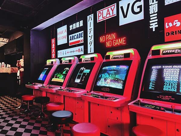 因為店裡大半的空間,完全被復古的遊戲機台佔據,滿滿一排的機台,加上牆上的各式燈牌,好像進入了日本的傳統電玩中心!每點一杯調酒,店員都會給我們2枚代幣,達到指定分數還會有免費的酒精獎勵喔!