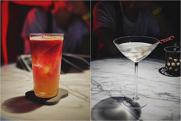 左邊的好像是芒果還是柳橙…..很入門,甜甜的沒甚麼酒味;右邊則是用珍珠洋蔥做成的馬丁尼,這杯非常見仁見智…..只有一位朋友可以接受它的味道
