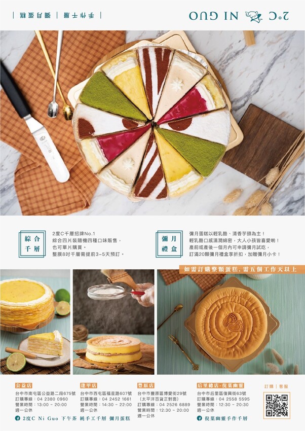2度C Ni Guo倪菓手作千層 在台中共有四間分店 分別是后里總店、逢甲店、豐原店跟公益店