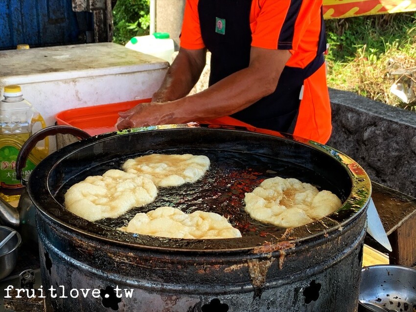 點好幾片後,老闆就會開始用麵糰,麵團壓平放進鍋內炸。