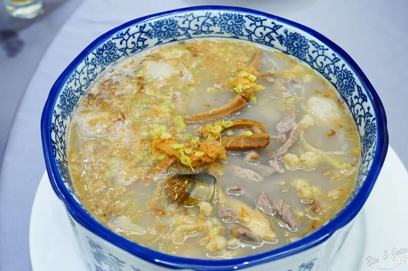 這道「鴨架湯」融入了山珍海味,除了鴨骨、還有條狀的鴨肉、飛虎魚丸、蛋酥、花菜乾、魷魚乾,