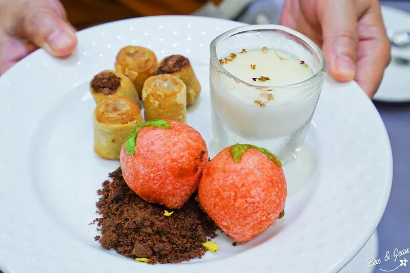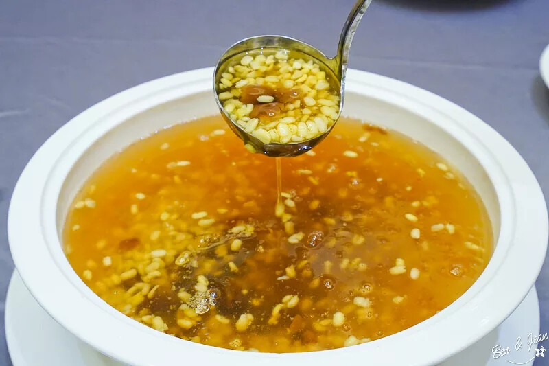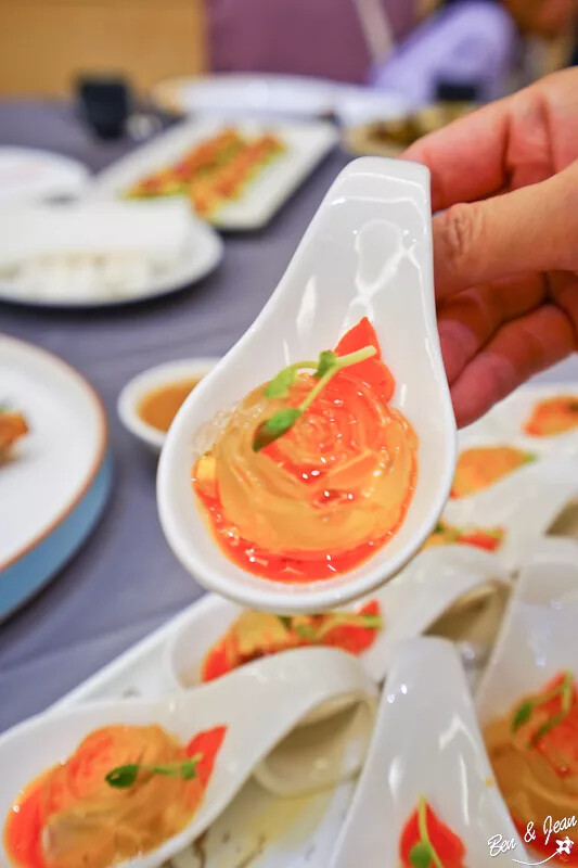 這道也很妙,設計靈感來自田間流淌的礁溪溫泉水,所以水晶透明的鴨舌凍,像是透明的溫泉水