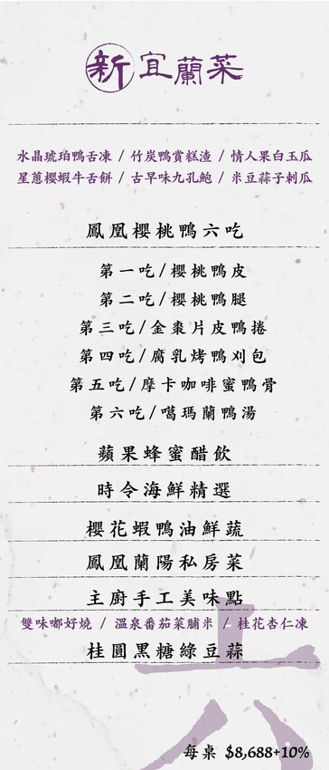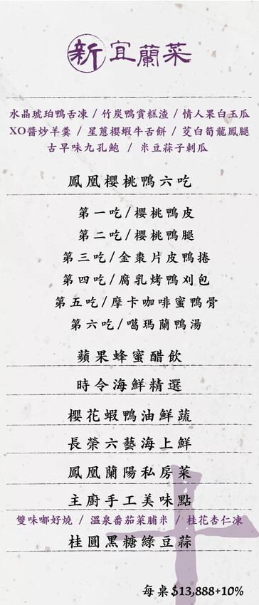 價位:10人席13888+10%、8人席11688+10%、6人席8688+10%、4人席5888+10%