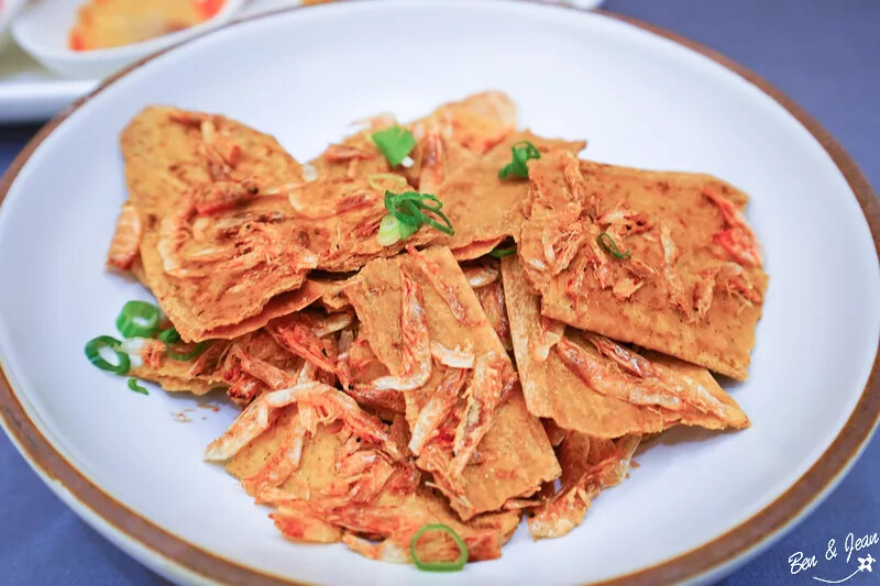 在牛舌餅上面灑三星蔥段與櫻花蝦,三種口味一次滿足,口感卡滋卡滋,鹹香之中帶點焦糖甜
