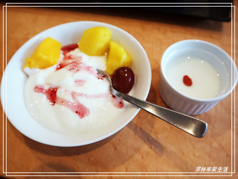 最後用優格水果來結束這一餐XD,這兒優格是有甜味的,所以其實根本不用再加草莓醬,反而有點太甜😆,杏仁豆腐清新不過甜也好吃。