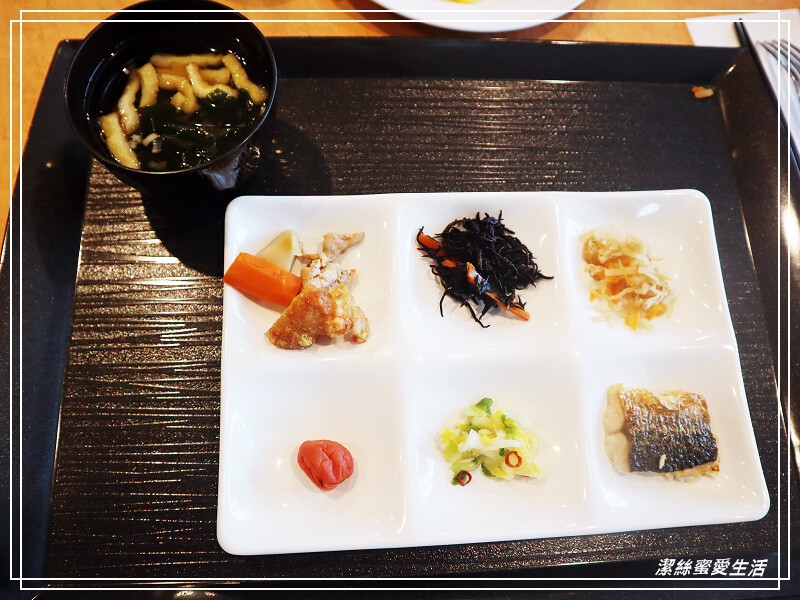 覺得特別的是這個九宮格餐盤,有別於我們常見的圓盤型式,我還很假掰地硬是把九格都夾滿,加上味噌湯,來個日式風格早餐😂😂。
