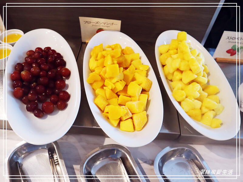 水果有三種,除了葡萄是新鮮的以外,其餘兩種芒果和鳳梨都是冷凍水果XD,有吃到幾顆還沒完全退冰的狀態,其實也蠻甜的,不過畢竟鮮度和口感還是不如現切的好吃。