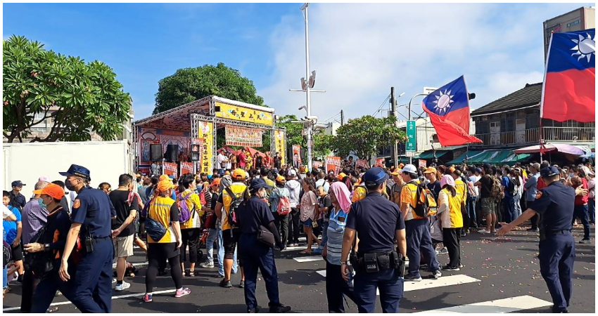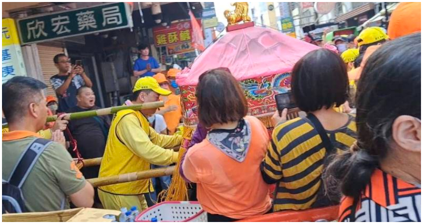 其中停留了李家天上聖母、遊天宮、聖興宮、普通民家、兩個競選總、還有一間藥局,其中印象深刻的是藥局,不知道為什麼,媽祖豪不猶豫就彎了進去,還停了超久的,那間藥局應該相當高興吧,一直聽到旁邊的人說藥局要大發了,因為太陽高照氣溫越債越熱,藥局除了本來就已經備好結緣飲料及供品外,因為已經在市區了人潮越來越多,又搬了更多的礦泉水、茶飲及運動飲料給大家,真是佛心來著。